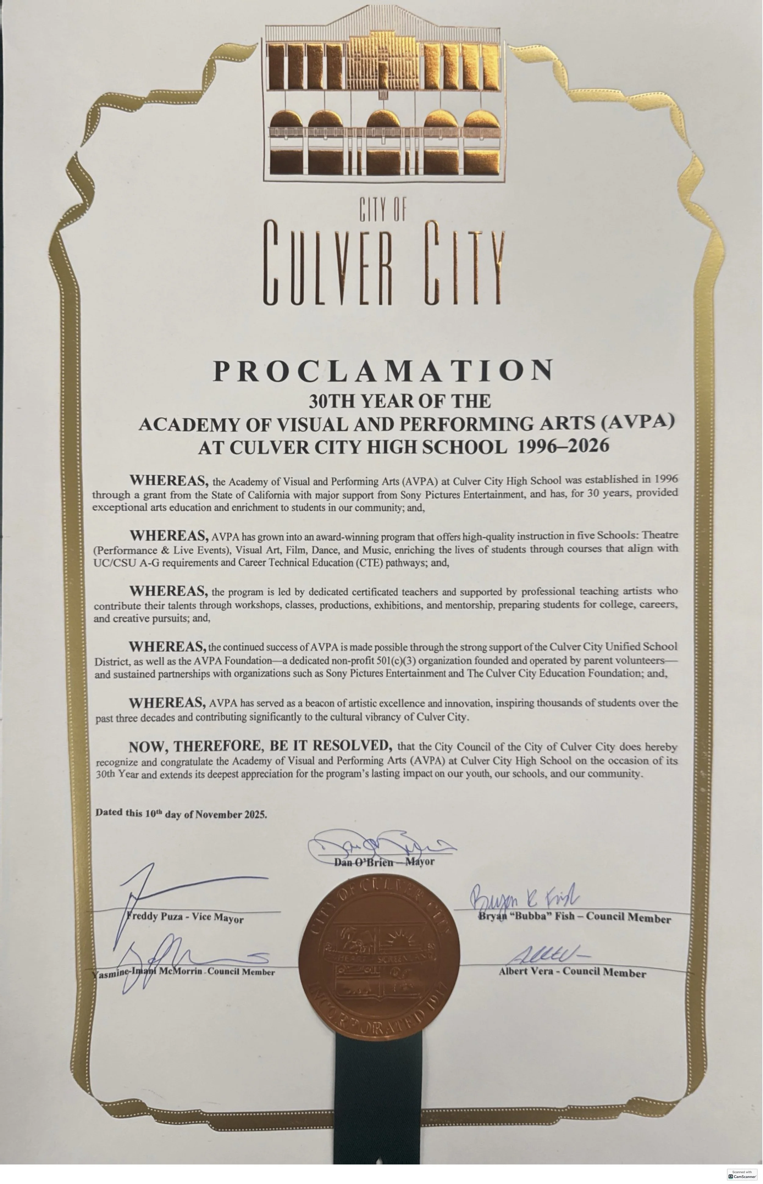 The City Council of Culver City presented a commendation of AVPA’s 30th year at the City Council meeting on Monday, November 10, 2025. Mayor Dan O’Brien and fellow council members presented the commendation while a gathering of numerous faculty, students, parents, and alumni attended.