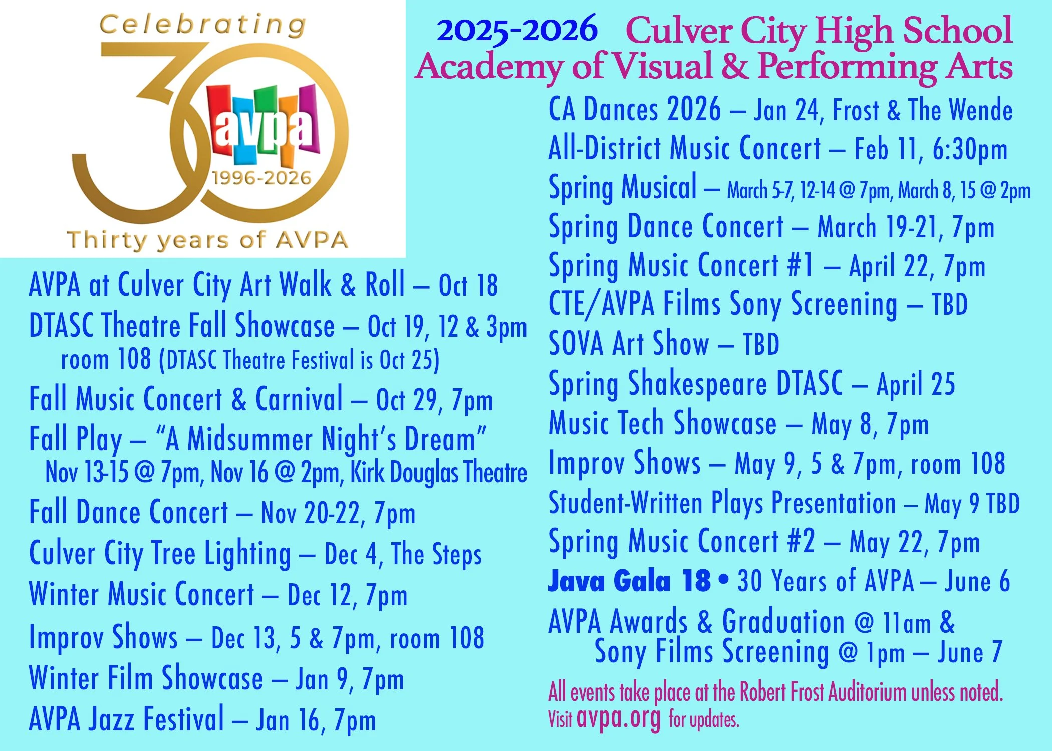 Celebrate AVPA’s 30th year by attending our many productions, concerts, events, and more!
